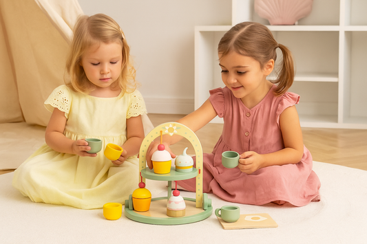 Pretend Play Toy Tea Set, Wooden Playset with Teapot, Cups & Saucers
